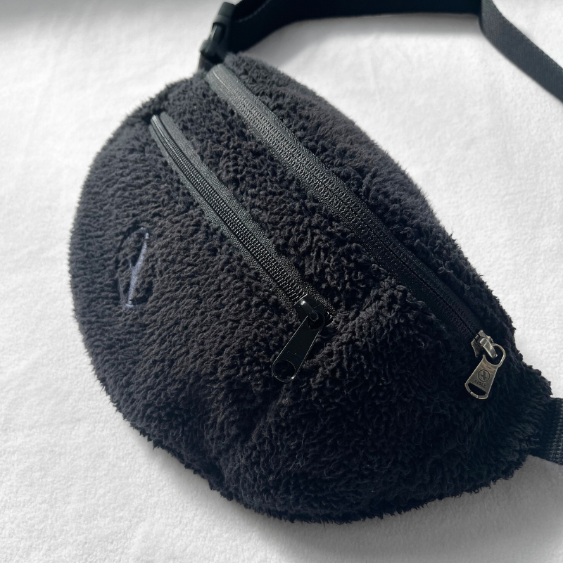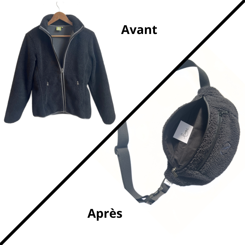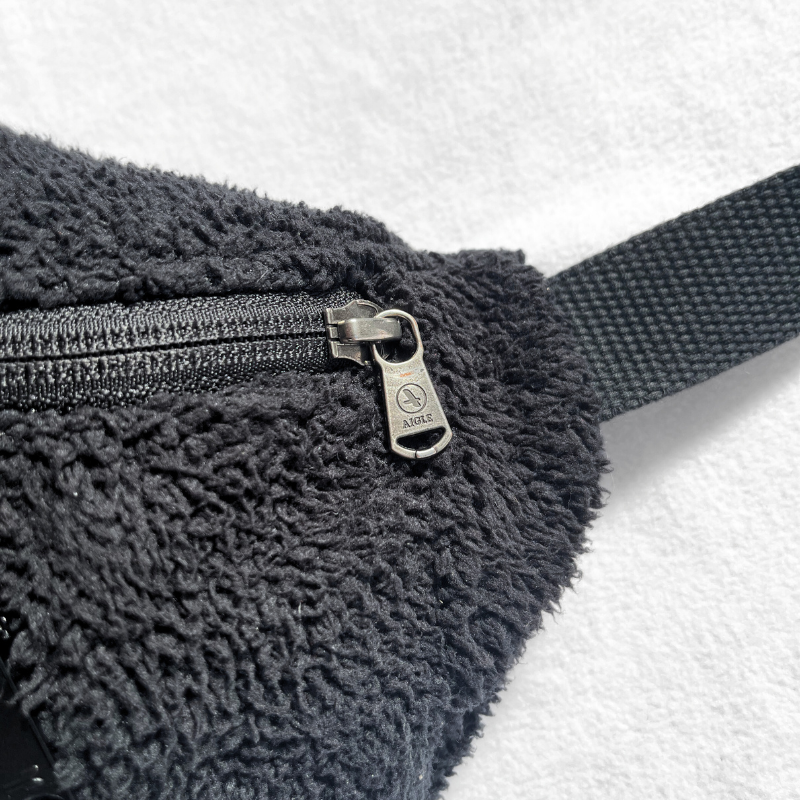 Banane en matière upcyclée : il s'agit d'une pièce unique réalisée à partir d'une polaire Aigle de seconde main*. Les éléments du vêtement d'origine ont été réutilisés pour la confection de cette banane, tels que la fermeture éclair principale ou l'empiècement avec logo sur le devant. Une poche incrustée se situe à l'arrière de la banane et une poche plaquée à l'intérieur.