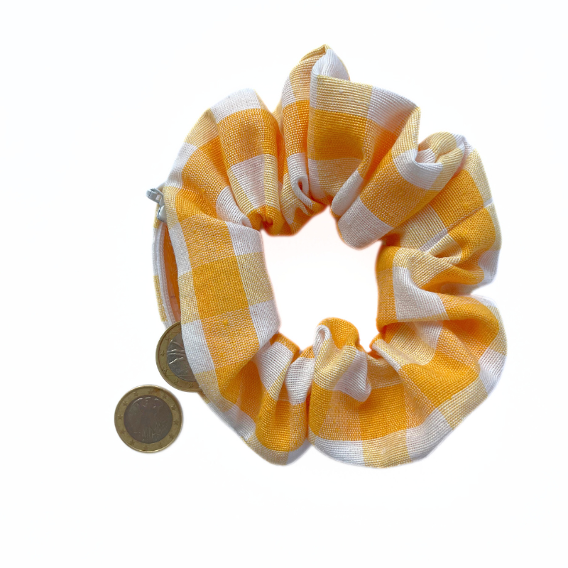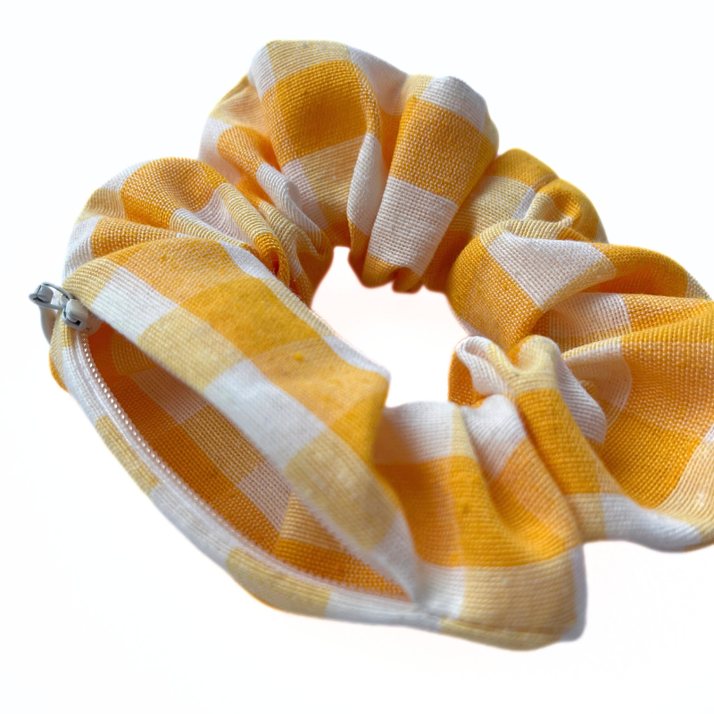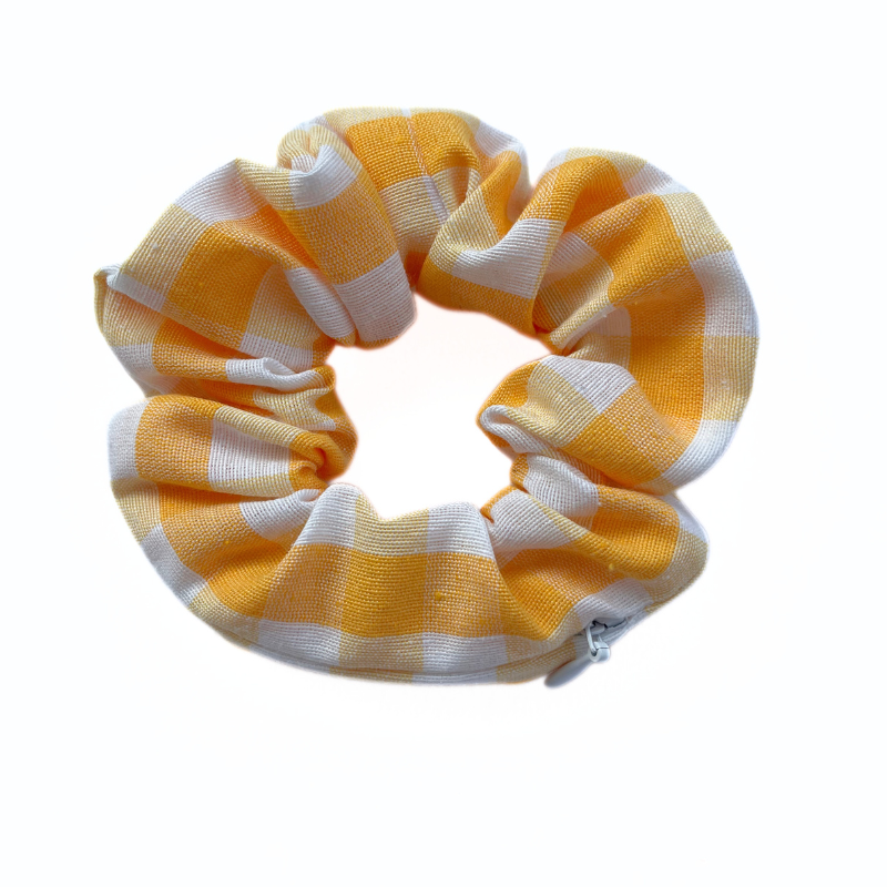 Chouchou magique en vichy jaune qui contient une petite poche secrète avec fermeture invisible