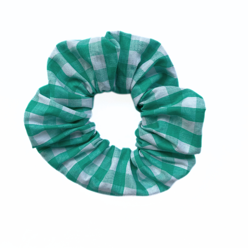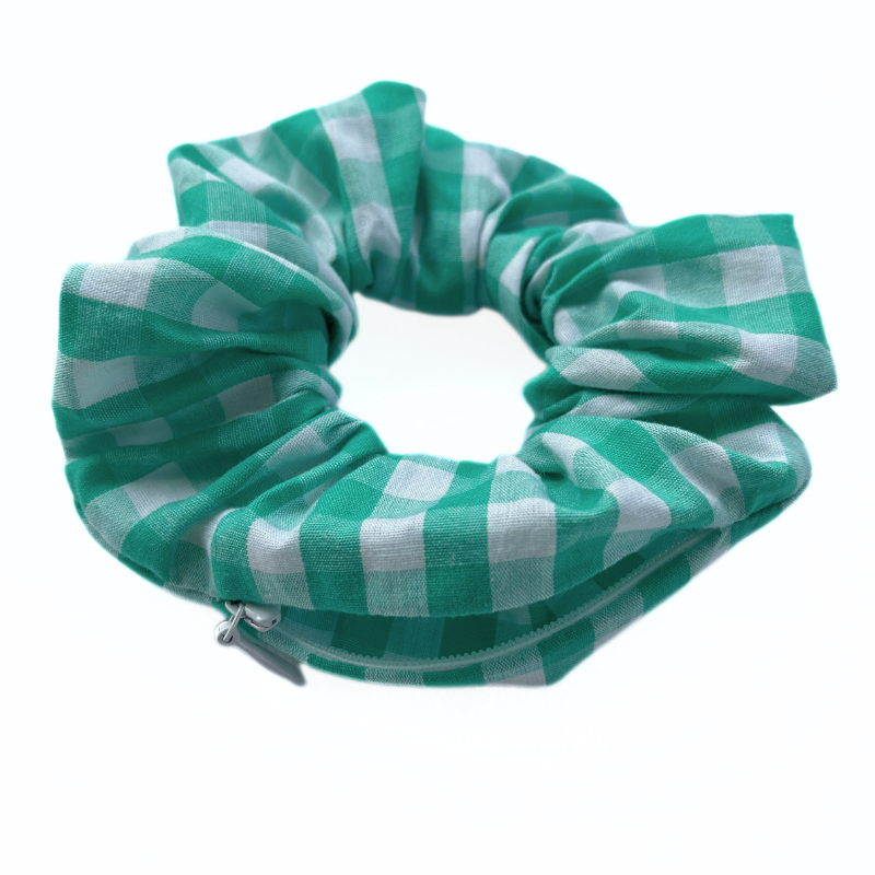 Chouchou magique en vichy vert qui contient une petite poche secrète avec fermeture invisible